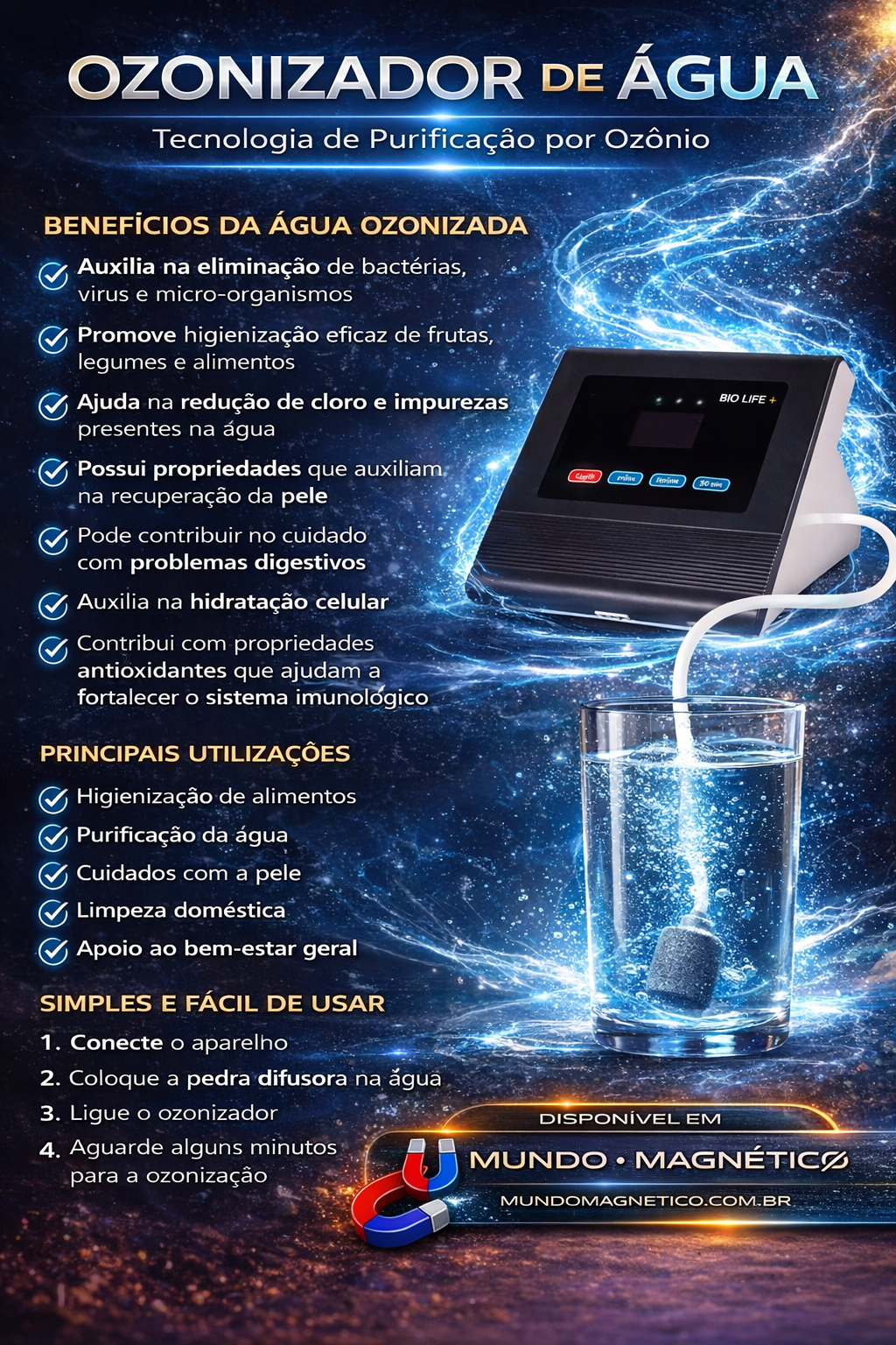 Ação antimicrobiana natural: combate bactérias, vírus e parasitas na água, tornando-a mais segura.