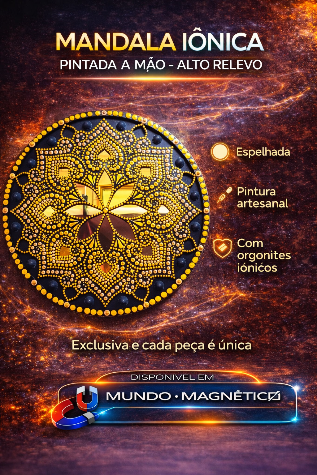 Nossa mandala recebe o nome de Mandala Iônica porque contém orgonites, materiais conhecidos por auxiliar na transformação da ionização do ambiente.